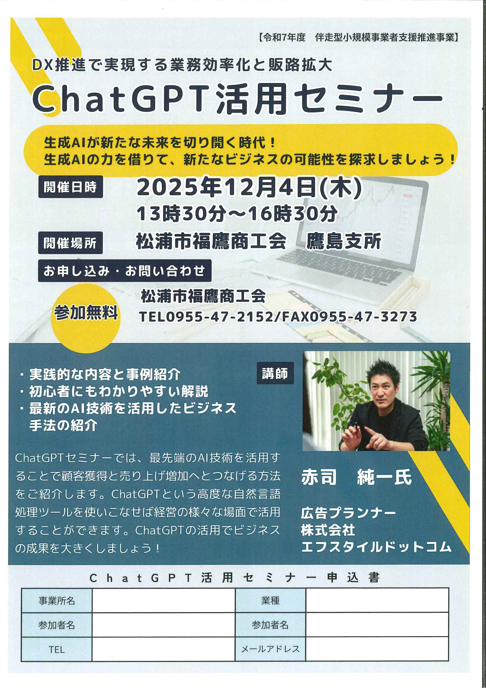 【日 時】 令和7年12月4日(木)13:30-16:30【講 師】 エフスタイルドットコム 赤司 純一氏【会 場】 松浦市福鷹商工会 鷹島支所【参加費】 無料【セミナー内容】1.実践的な内容と事例紹介2.初心者にもわかりやすい解説3.最新のAI技術を活用したビジネス手法の紹介 ほか